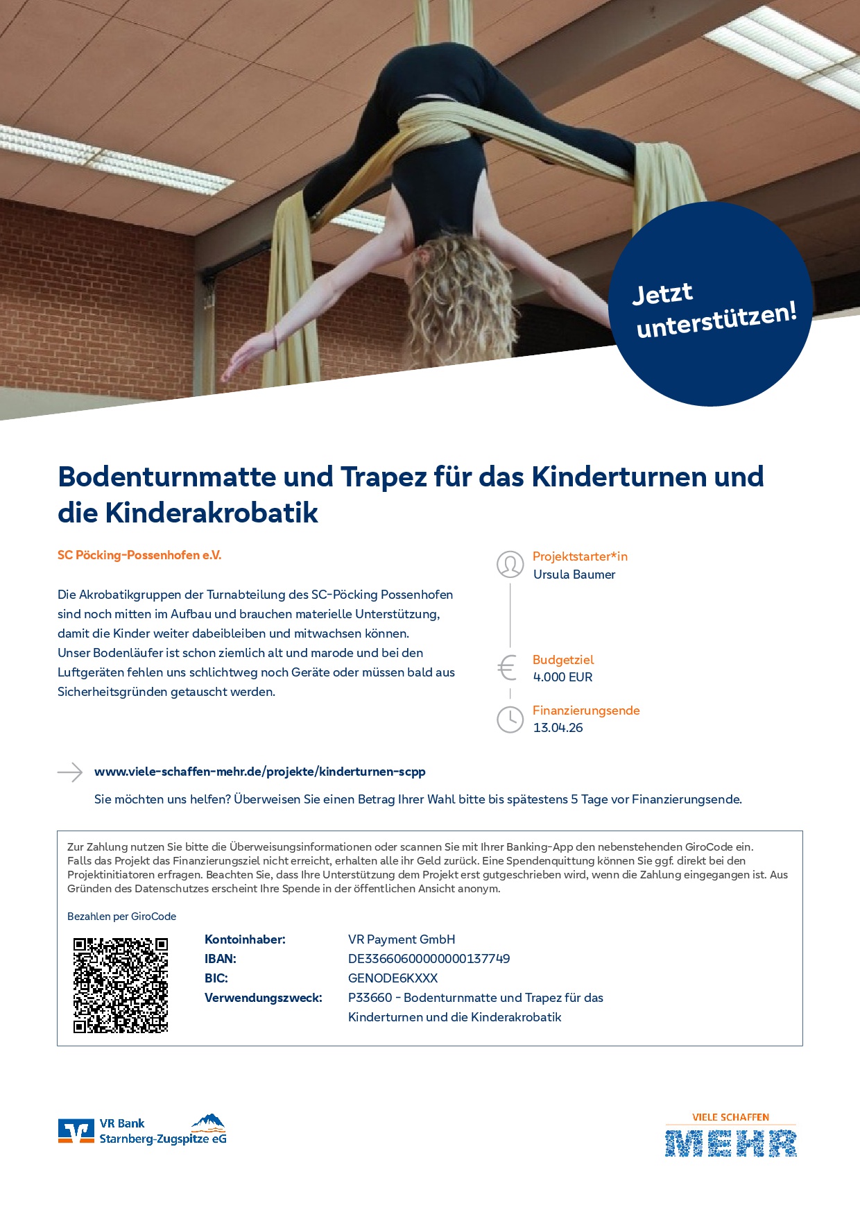 Große Freude bei den Kinderturngruppen des SC Pöcking-Possenhofen e.V.: Dank einer großzügigen Spende der Stiftung für Pöcking konnte eine neue Weichbodenmatte für das Kindertraining angeschafft werden. Während einer Kinderturnstunde überreichte die Stiftung symbolisch einen Scheck in Höhe von 500 Euro. „Mit der neuen Matte können unsere Jüngsten sicherer und mit noch mehr Spaß turnen“, sagte Abteilungsleiterin Ursula Baumer, die sich gemeinsam mit den Kindern herzlich für die Unterstützung bedankte. Die Anschaffung verbessert nicht nur die Trainingsbedingungen, sondern fördert auch die Bewegungsfreude und motorische Entwicklung der Kinder.